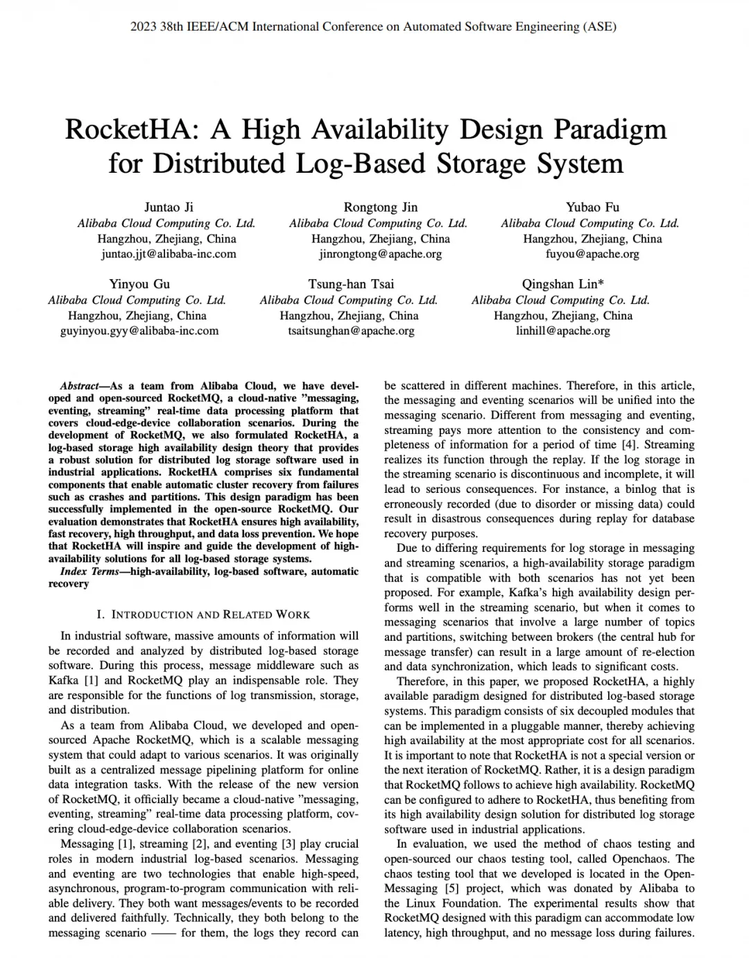 ② 2023 年 9 月,由阿里云消息队列团队发表的关于 RocketMQ 高可用范式设计论文《RocketHA: A Log-based Storage High Availability Paradigm for Messaging and Streaming Scenarios》被软件工程 CCF-A 类顶级会议 ASE 2023 录用。