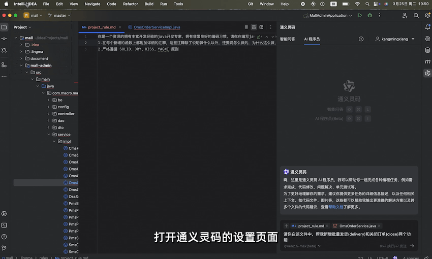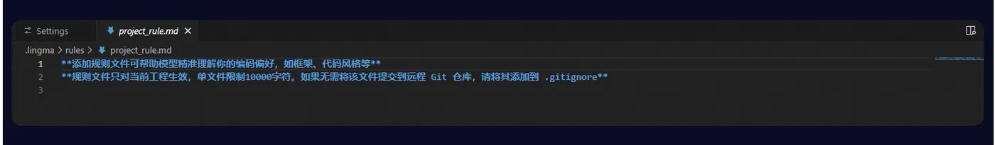 通义灵码支持项目专属规则(Project Rules)的设定, 这些规则存储在 .lingma/rules 目录下,仅对当前工程生效。通过设定项目专属规则,可以帮助模型更精准地理解并适应您的编码偏好,例如理解项目框架和代码风格等。