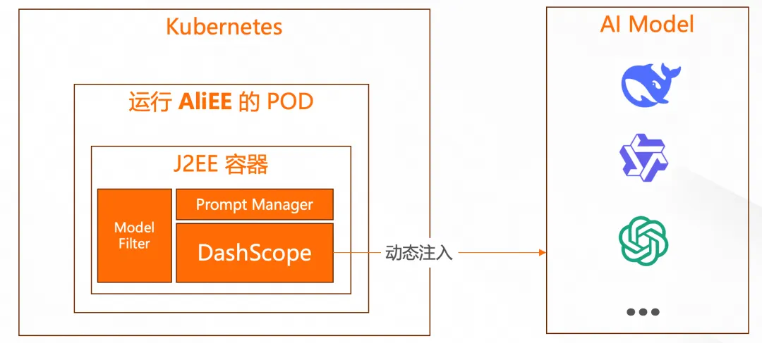 基于阿里云的 DashScope SDK ,阿里云在应用服务器中实现了传统 J2EE 应用与大模型的互通的能力,架构图如下图所示: