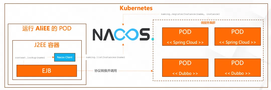 通过独创的"渐进式容器化"技术,阿里云基于 Nacos 实现了传统 EJB 容器与微服务体系的互通技术,架构图如下所示: