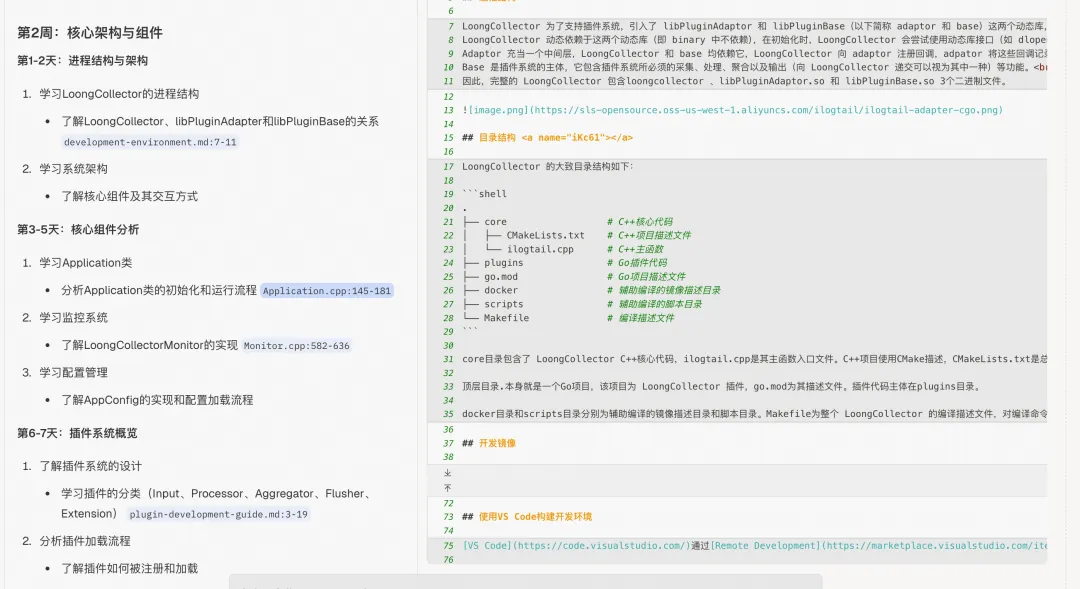 如果说传统的代码文档是“静态的说明书”,DeepWiki 的结构化文档则是一张“动态技术地图”。它通过 AI 语义分析,将 LoongCollector 的复杂架构转化为可交互的知识资产。