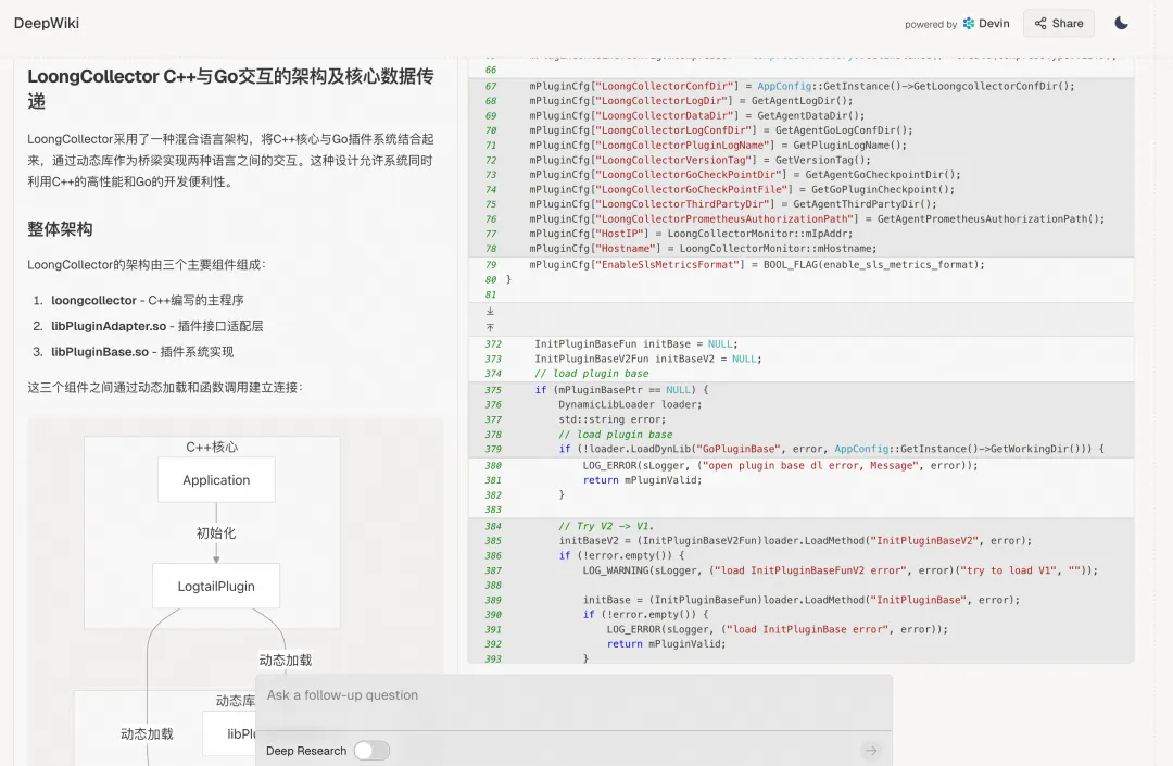 LoongCollector 提供了 Go 语言插件的可扩展性,通过向 DeepWiki 提问,开发者可以了解更深层次的 C++/Go 交互原理。