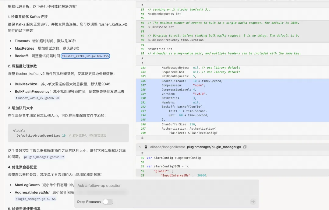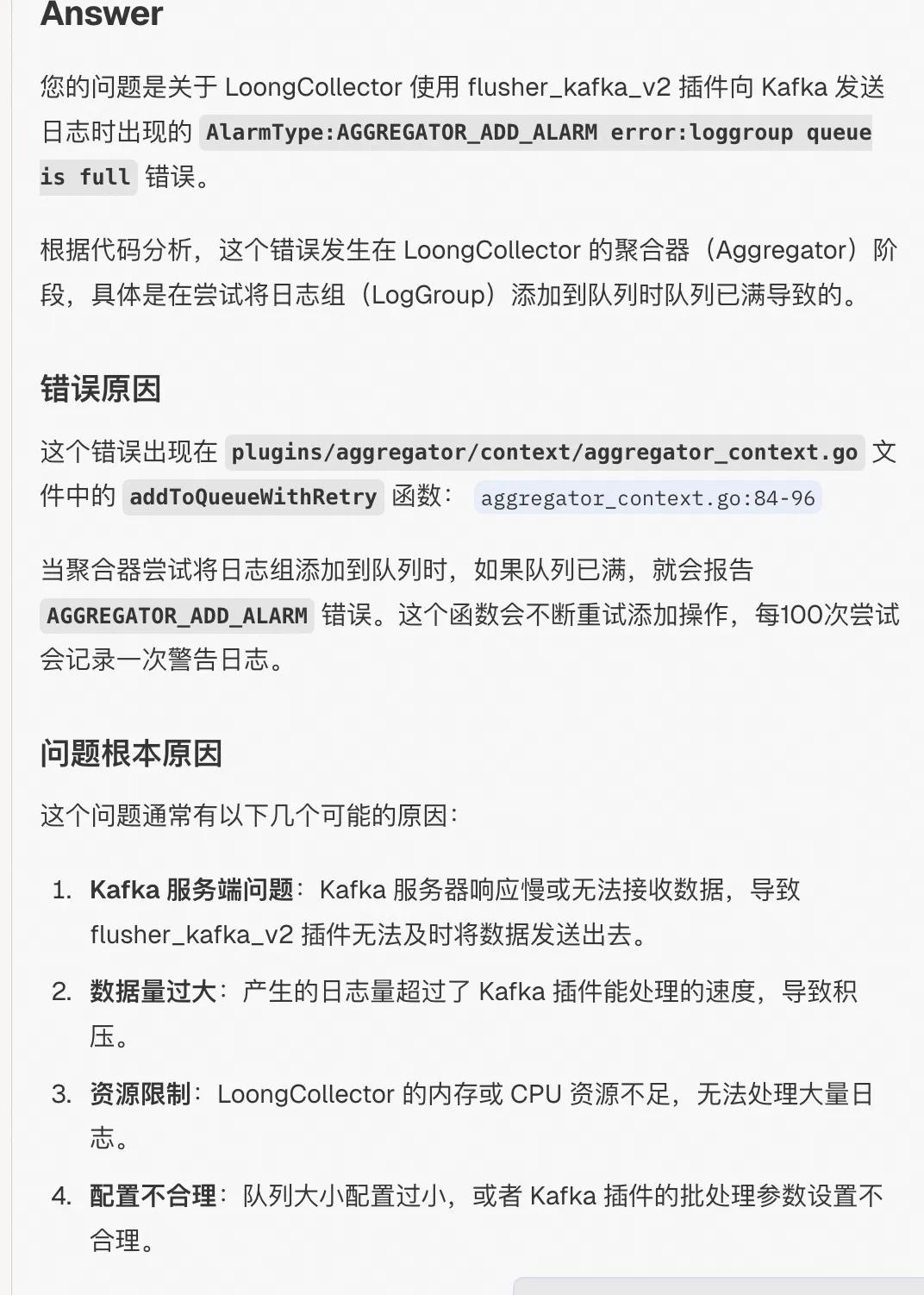 我们以 flusher_kafka_v2 插件为例,当开发者将日志采集至 Kafka 时,若遇到“AlarmType:AGGREGATOR_ADD_ALARM error:loggroup queue is full” 报错,常引发性能瓶颈与数据丢失风险。针对此类场景,DeepWiki 通过多维度分析,从队列配置、网络传输、资源竞争等角度系统性揭示反压成因,并提供可操作的解决方案。