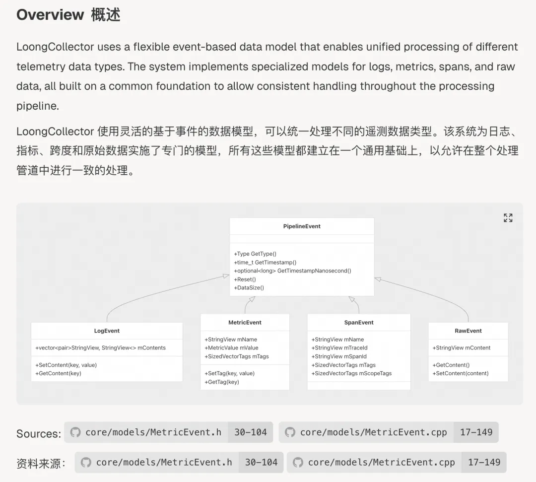 掌握核心数据架构是学习开源软件源码的关键,但是初学者往往抓不住重点,无从下手。通过 DeepWiki 开发者可以轻松获取 LoongCollector 核心数据模型的类型与关系,有了基础数据模型的理解,学习更高层次的源码将事倍功半。
