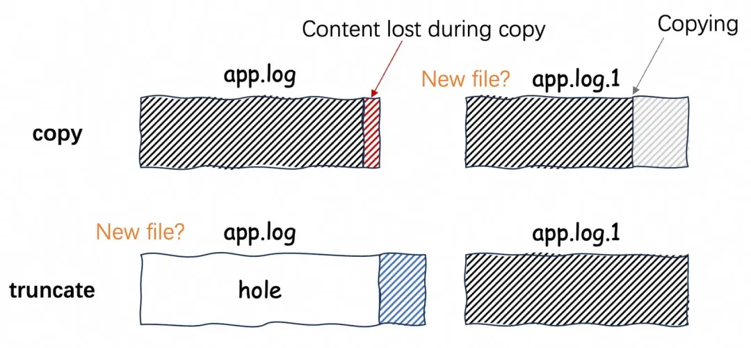 因此,copy truncate 模式可能导致日志重复采集、内容丢失或不一致的问题。