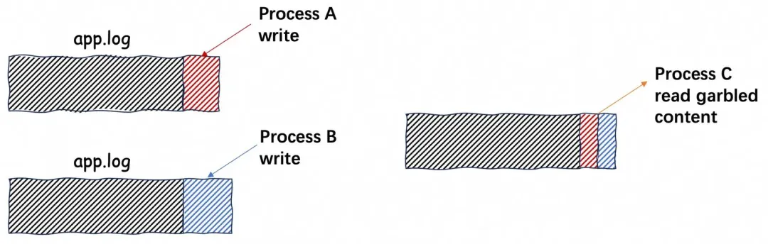 a. 文件内容交叉。多个进程的写入可能相互交叉,导致日志条目混乱。