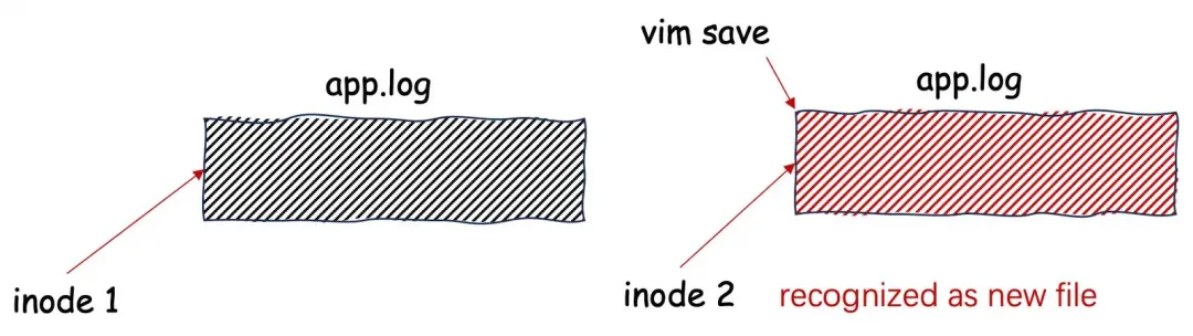 a. inode 变化。vim 创建新文件替换原文件时,新文件的 inode 与原文件不同,可能导致采集器误判为新文件。