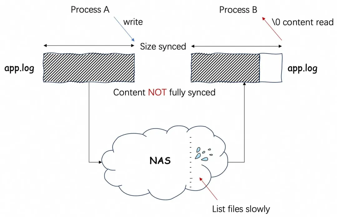 b. 读取到文件空洞。当元信息显示文件已增大,但实际内容尚未同步时,读取操作可能返回 \0 字符(文件空洞)。