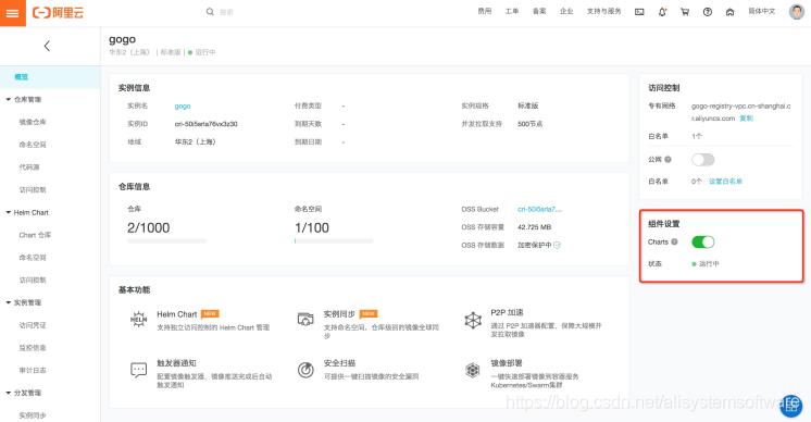 容器镜像服务企业版支持 v2 版本的 Chart 安全托管,在企业版实例概览页开启 Charts 组件,待组件状态变为运行中,即可开始托管 Chart 类型仓库。