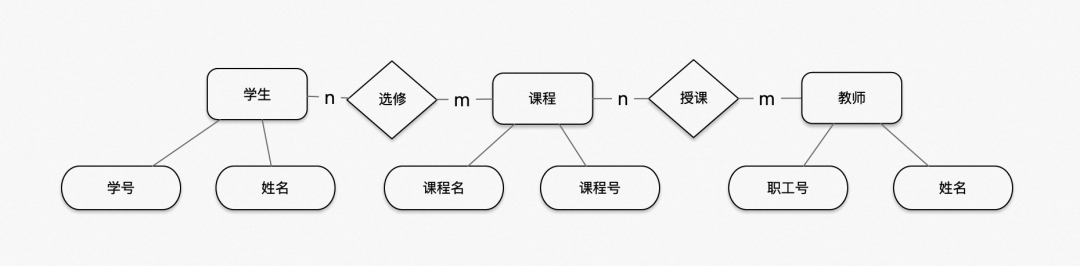 E-R图(Entity Relationship Diagram)也称实体关系图,是一种用来描述实体、属性和关系的模型。我们常用矩形来表示现实中客观存在且相互区别的实体,用椭圆来表示实体具有的某一特征,用菱形来表示实体和实体间一对一,一对多和多对多的关系。假如现在回到我们大学的数据库课堂上,那么你一定不会对下面这个图感到陌生。