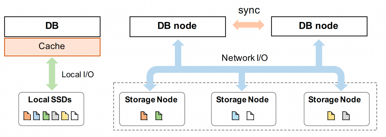 下图左边是本地集中式数据库,右边是计算存储分离架构数据库。本地数据库通过本机 Cache 到 Local I/O再到 Local SSDs;计算存储分离架构数据库:在计算存储分离架构下会带来网络开销,同时也会产生其他存储副本。