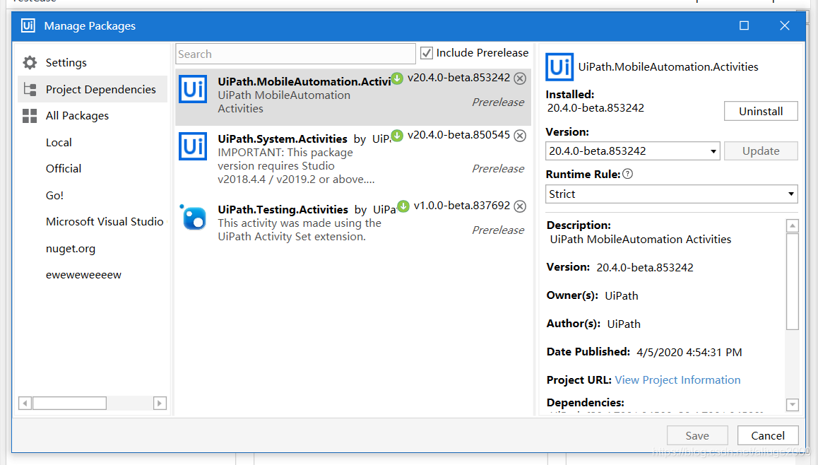 新建一个工程后查看包管理,可以看到 UiPath.MobileAutomation测试版本。