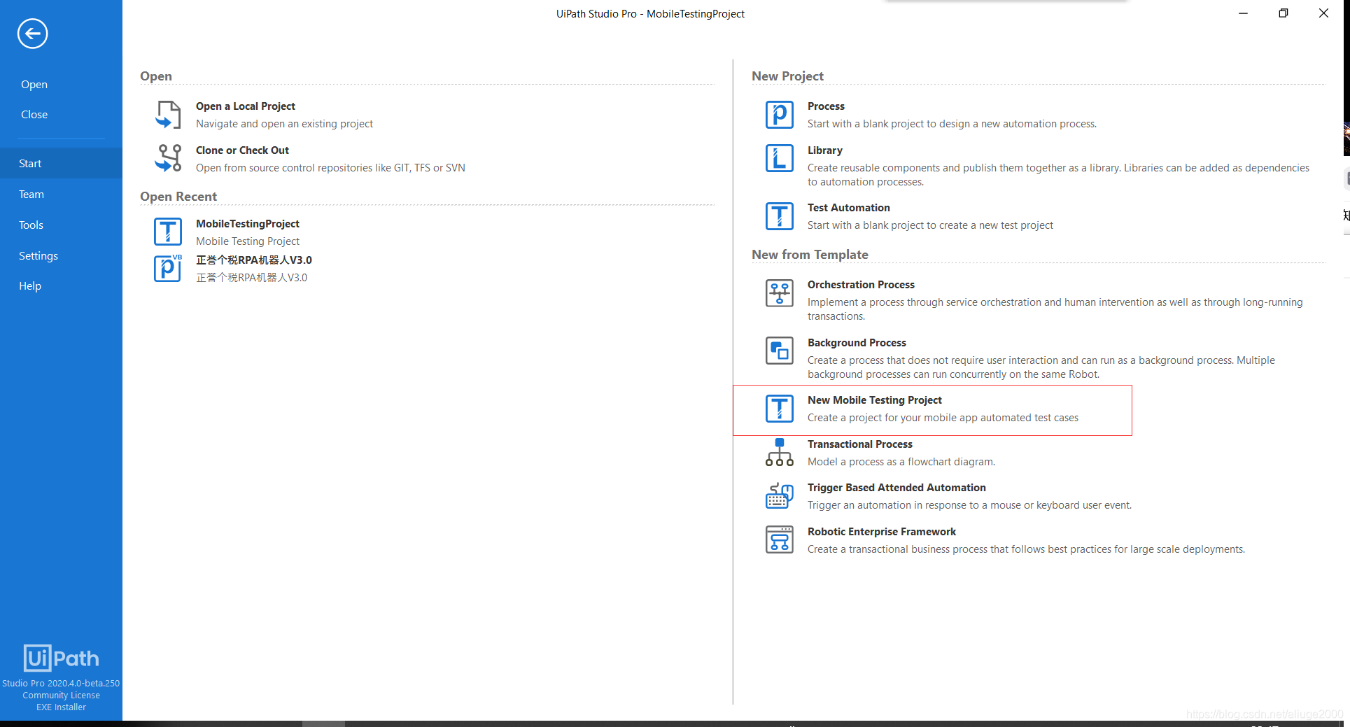 打开uiapth 可以发现出再现了一个New Mobile Testing 的工程