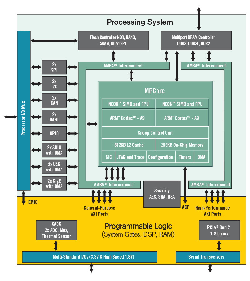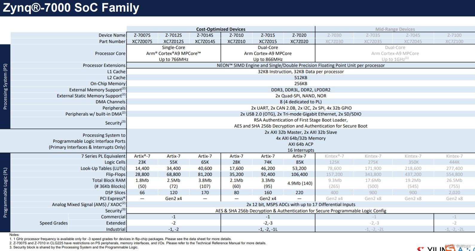 点击放大 | Zynq-7000 Zynq-7000 器件配备双核 ARM Cortex-A9 处理器,该处理器与基于 28nm Artix-7 或 Kintex®-7 的可编程逻辑集成,可实现优异的性能功耗比和最大的设计灵活性。Zynq-7000 具有高达 6.25M 的逻辑单元以及从 6.6Gb/s 到 12.5Gb/s 的收发器,可为多摄像头驾驶员辅助系统和 4K2K 超高清电视等大量嵌入式应用实现高度差异化的设计。 |