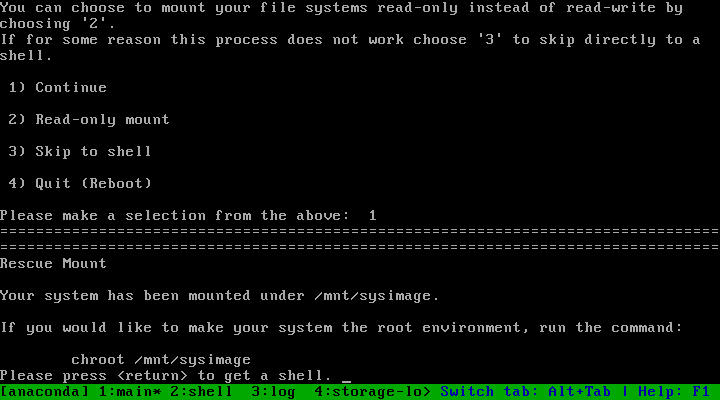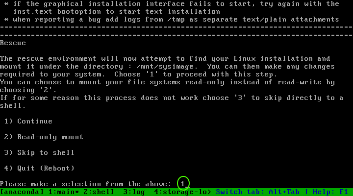 Step-3:在这里选择1,救援环境现在将尝试找到Linux安装并将其安装在目录下/mnt/sysimage。