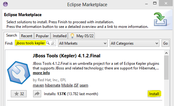 3.然后将jboss 工具 kepler写入“查找”区域。您可以看到包含JBoss Tools(Kepler)插件的结果。请安装此插件。