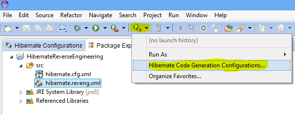 9。单击Finish按钮后,单击箭头图标,如下图所示。现在打开Hibernate Code Generation 配置区域。