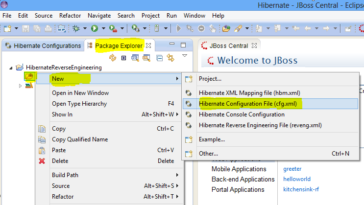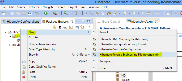 3.在Package Explorer选项卡中,右键单击src文件夹,然后选择New- > Hibernate Configuration File (.cfg.xml)