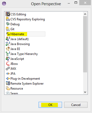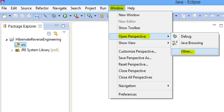 2.通过单击“窗口”,然后单击“打开 透视图”按钮,将Windows透视图更改为Hibernate 。