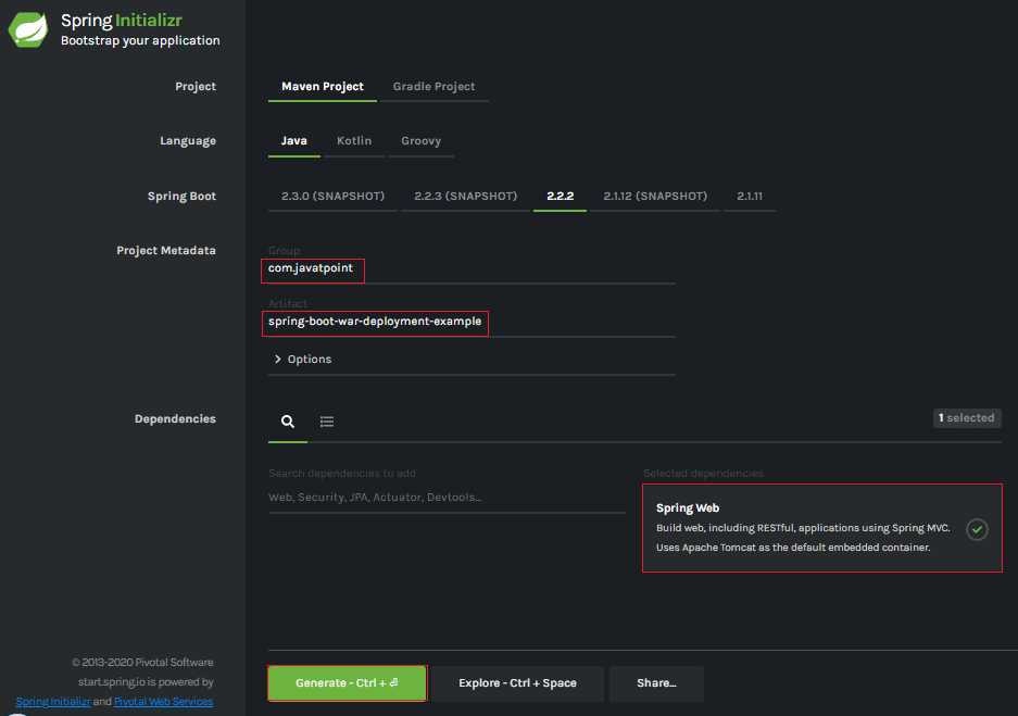 第 3 步:提供工件ID。我们提供了spring-boot-war-deployment-example。