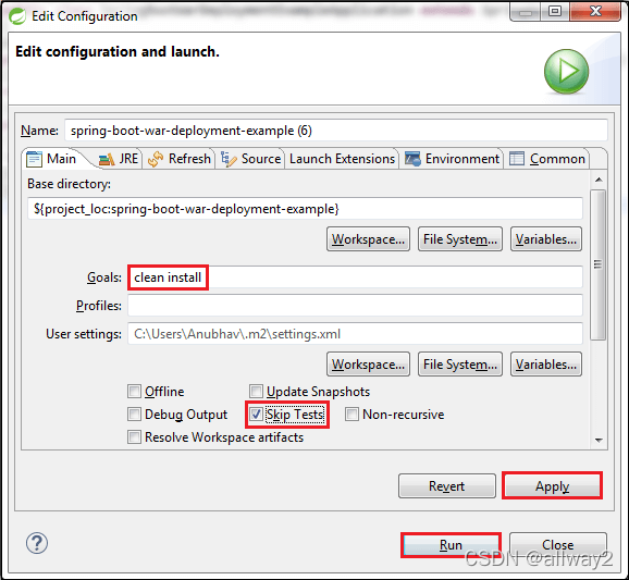 第 17 步:在“目标”标签中编写全新安装并检查“跳过测试” 。分别单击应用和运行按钮。