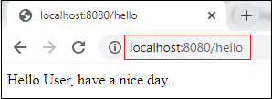 第 23 步:打开浏览器并调用 URL http://localhost:8080/web-services/hello。它返回消息Hello User, have a nice day。