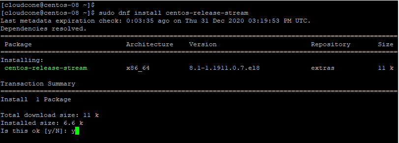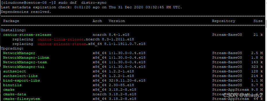 该distro-sync命令将执行所有必需的升级,并确定要保留哪些包或匹配启用的存储库中的最新版本。只需输入“Y”并按 ENTER 键即可开始从 CentOS 8 迁移到 CentOS Stream。迁移需要一段时间,具体取决于您的互联网速度。
