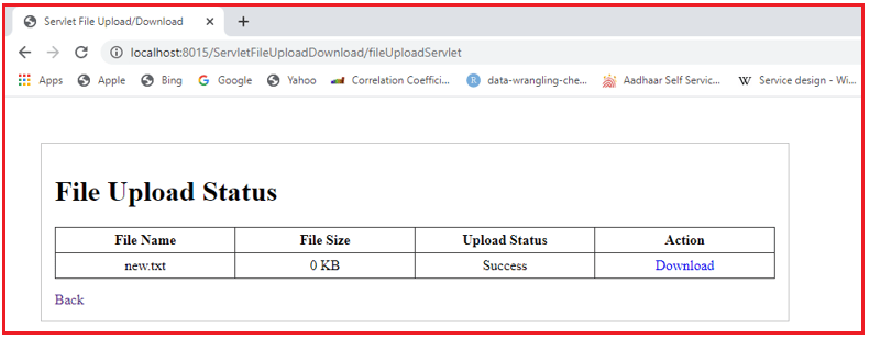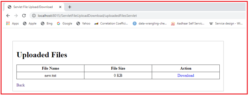单击“列出所有上传的文件”链接后,您将收到以下响应。单击“下载”链接以下载特定文件。