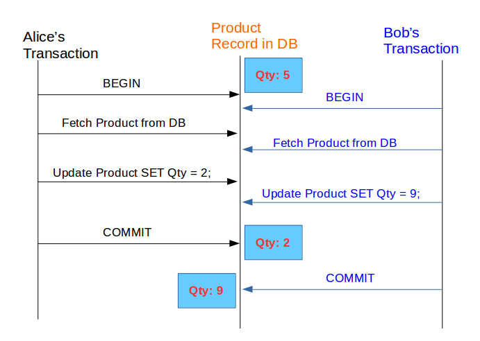 当两个并发事务同时更新相同的数据库记录/列时,导致第一个更新被第二个事务以静默方式覆盖。数据库中的这种现象被称为经典的更新丢失问题。以下是丢失更新时的事件顺序-
