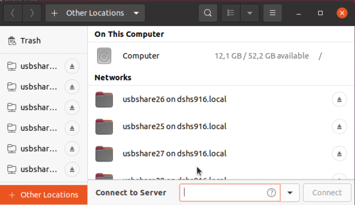 一系列网络共享由“gio mount”支持。还有SMB协议。但是,为了排除网络中的问题,建议通过“文件”、“其他位置”和“连接到服务器”一次集成所需的共享。
