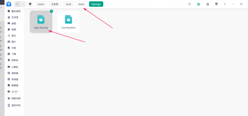 双击桌面计算机图标,进入数据盘,使用“Ctrl+H”组合键打开隐藏文件夹,依次打开.local、share、deepin-keyrings-wb文件夹,然后找到login.keyring,删除此login.keyring文件可以消除弹窗提示;