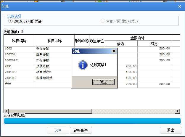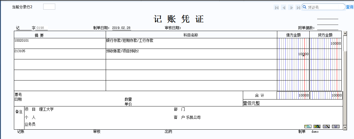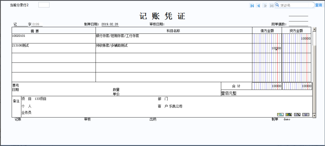 3.填写两条凭证:198和199(业务逻辑可能不正确,只限于验证后台数据),凭证号每月都是从1开始排的。