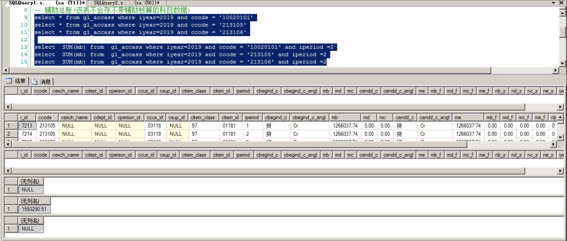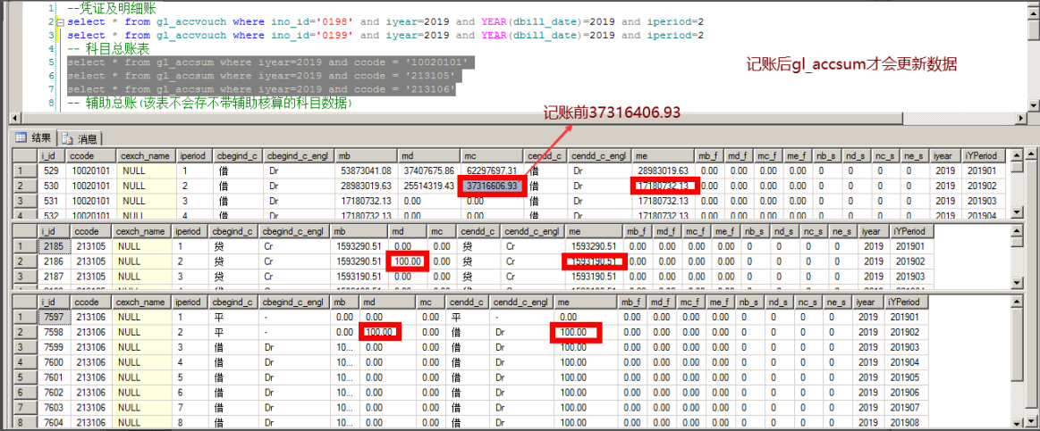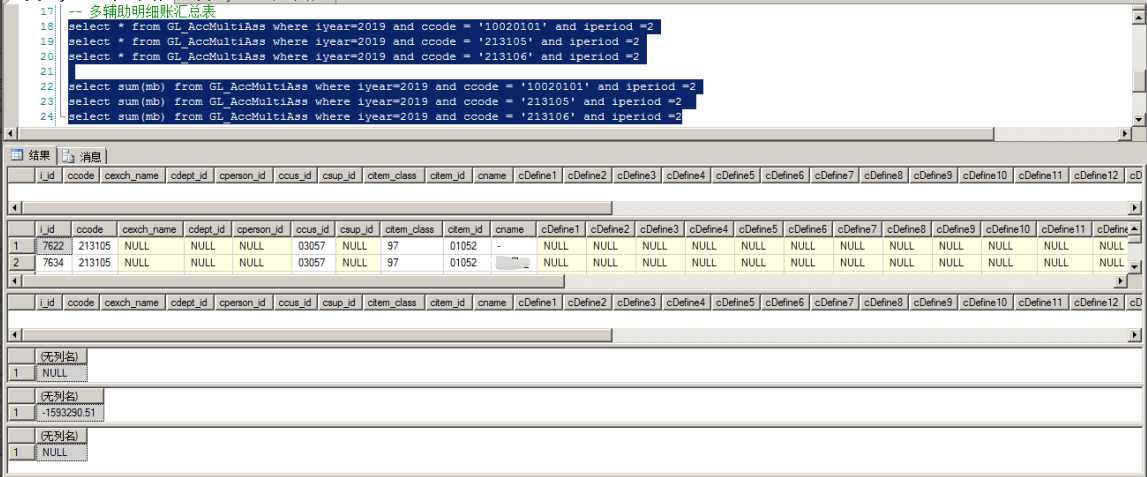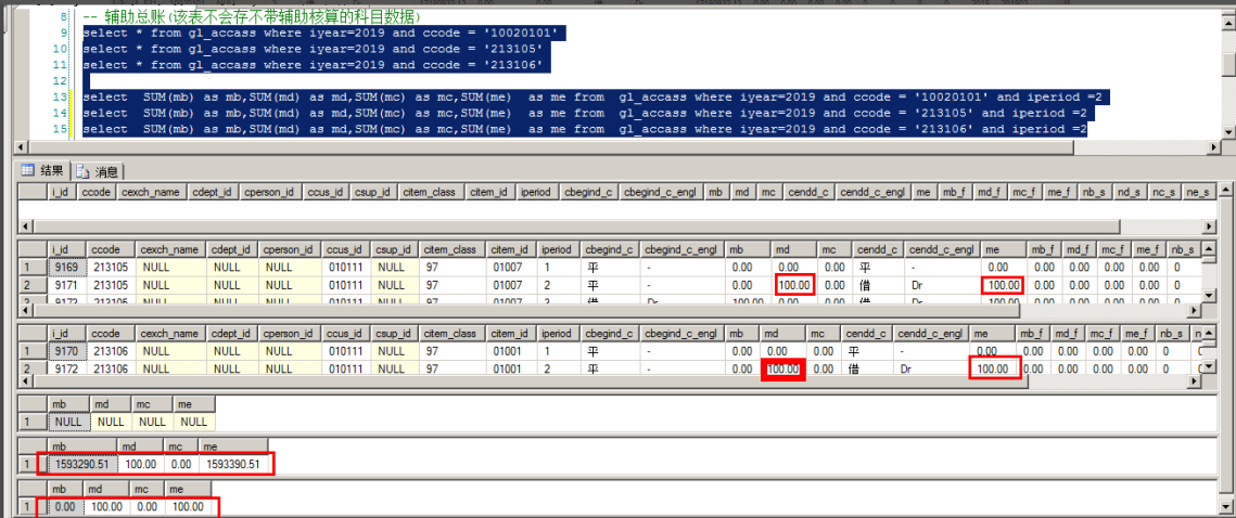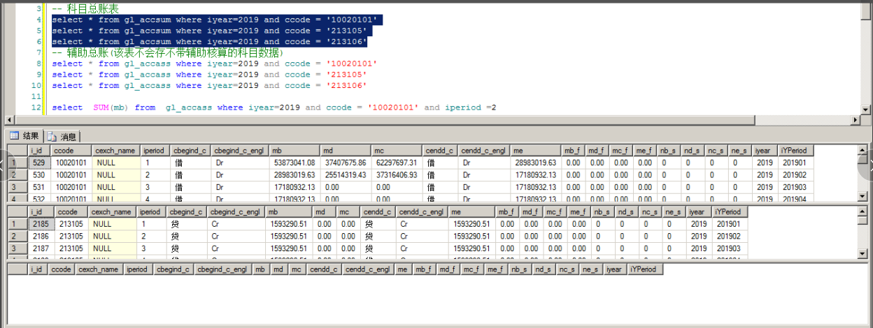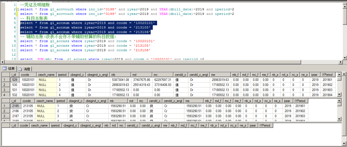1 --凭证及明细账 2 select * from gl_accvouch where ino_id='0198' and iyear=2019 and YEAR(dbill_date)=2019 and iperiod=2 3 select * from gl_accvouch where ino_id='0199' and iyear=2019 and YEAR(dbill_date)=2019 and iperiod=2 4 -- 科目总账表 5 select * from gl_accsum where iyear=2019 and ccode = '10020101' 6 select * from gl_accsum where iyear=2019 and ccode = '213105' 7 select * from gl_accsum where iyear=2019 and ccode = '213106' 8 -- 辅助总账(该表不会存不带辅助核算的科目数据) 9 select * from gl_accass where iyear=2019 and ccode = '10020101' 10 select * from gl_accass where iyear=2019 and ccode = '213105' 11 select * from gl_accass where iyear=2019 and ccode = '213106' 12 13 select SUM(mb) as mb,SUM(md) as md,SUM(mc) as mc,SUM(me) as me from gl_accass where iyear=2019 and ccode = '10020101' and iperiod =2 14 select SUM(mb) as mb,SUM(md) as md,SUM(mc) as mc,SUM(me) as me from gl_accass where iyear=2019 and ccode = '213105' and iperiod =2 15 select SUM(mb) as mb,SUM(md) as md,SUM(mc) as mc,SUM(me) as me from gl_accass where iyear=2019 and ccode = '213106' and iperiod =2 16 17 -- 多辅助明细账汇总表 18 select * from GL_AccMultiAss where iyear=2019 and ccode = '10020101' and iperiod =2 19 select * from GL_AccMultiAss where iyear=2019 and ccode = '213105' and iperiod =2 20 select * from GL_AccMultiAss where iyear=2019 and ccode = '213106' and iperiod =2 21 22 select SUM(mb) as mb,SUM(md) as md,SUM(mc) as mc,SUM(me) as me from GL_AccMultiAss where iyear=2019 and ccode = '10020101' and iperiod =2 23 select SUM(mb) as mb,SUM(md) as md,SUM(mc) as mc,SUM(me) as me from GL_AccMultiAss where iyear=2019 and ccode = '213105' and iperiod =2 24 select SUM(mb) as mb,SUM(md) as md,SUM(mc) as mc,SUM(me) as me from GL_AccMultiAss where iyear=2019 and ccode = '213106' and iperiod =2
