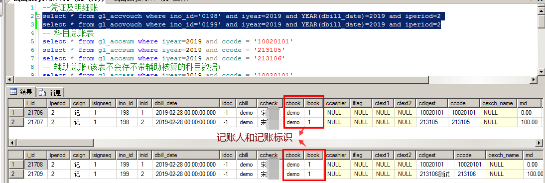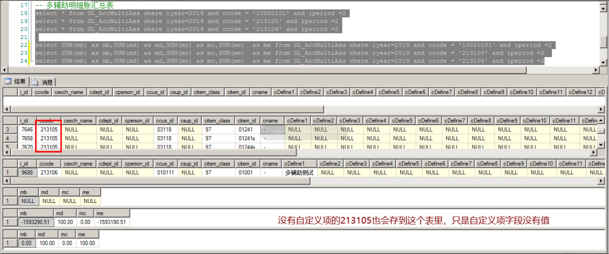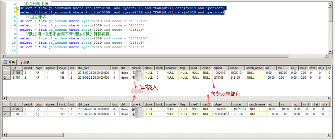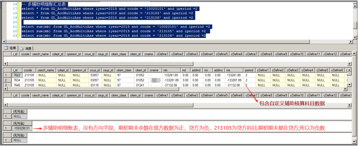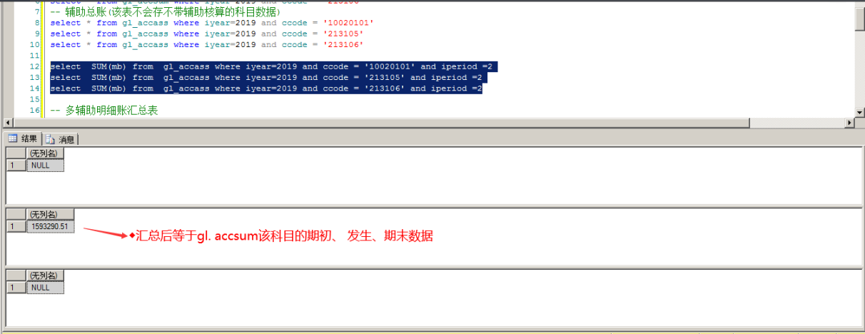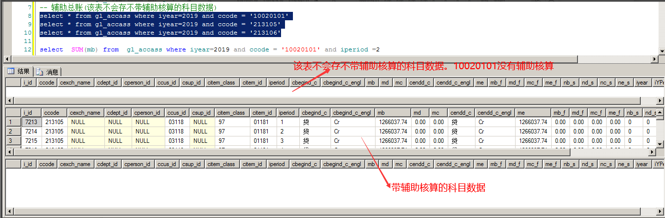 1 --凭证及明细账 2 select * from gl_accvouch where ino_id='0198' and iyear=2019 and YEAR(dbill_date)=2019 and iperiod=2 3 select * from gl_accvouch where ino_id='0199' and iyear=2019 and YEAR(dbill_date)=2019 and iperiod=2 4 -- 科目总账表 5 select * from gl_accsum where iyear=2019 and ccode = '10020101' 6 select * from gl_accsum where iyear=2019 and ccode = '213105' 7 select * from gl_accsum where iyear=2019 and ccode = '213106' 8 -- 辅助总账(该表不会存不带辅助核算的科目数据) 9 select * from gl_accass where iyear=2019 and ccode = '10020101' 10 select * from gl_accass where iyear=2019 and ccode = '213105' 11 select * from gl_accass where iyear=2019 and ccode = '213106' 12 13 select SUM(mb) as mb,SUM(md) as md,SUM(mc) as mc,SUM(me) as me from gl_accass where iyear=2019 and ccode = '10020101' and iperiod =2 14 select SUM(mb) as mb,SUM(md) as md,SUM(mc) as mc,SUM(me) as me from gl_accass where iyear=2019 and ccode = '213105' and iperiod =2 15 select SUM(mb) as mb,SUM(md) as md,SUM(mc) as mc,SUM(me) as me from gl_accass where iyear=2019 and ccode = '213106' and iperiod =2 16 17 -- 多辅助明细账汇总表 18 select * from GL_AccMultiAss where iyear=2019 and ccode = '10020101' and iperiod =2 19 select * from GL_AccMultiAss where iyear=2019 and ccode = '213105' and iperiod =2 20 select * from GL_AccMultiAss where iyear=2019 and ccode = '213106' and iperiod =2 21 22 select SUM(mb) as mb,SUM(md) as md,SUM(mc) as mc,SUM(me) as me from GL_AccMultiAss where iyear=2019 and ccode = '10020101' and iperiod =2 23 select SUM(mb) as mb,SUM(md) as md,SUM(mc) as mc,SUM(me) as me from GL_AccMultiAss where iyear=2019 and ccode = '213105' and iperiod =2 24 select SUM(mb) as mb,SUM(md) as md,SUM(mc) as mc,SUM(me) as me from GL_AccMultiAss where iyear=2019 and ccode = '213106' and iperiod =2