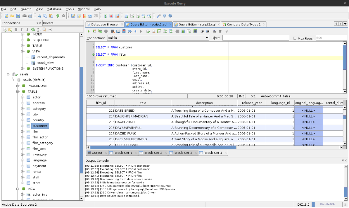Query Editor: The Query Editor allows for the execution of any SQL statement(s) that the database and driver may accept from creating tables to basic SELECT statements and table updates. The results of any executed statement is displayed in the results pane including database specific messages and error codes. The editor now supports multiple statement execution including multiple result sets. Enhancements have been made to bring it in line with most common development editors of this type.