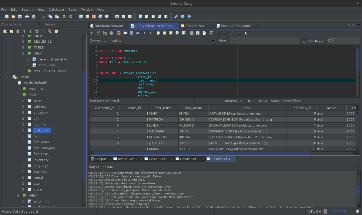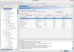 Using the flexibility provided by Java Database Connectivity (JDBC), Execute Query provides a simple way to interact with almost any database from simple queries to table creation and import/export of an entire schema's data. See Features for a list of some of the available tools.