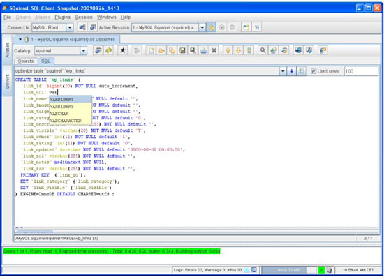The SQL tab offer a syntax sensitive editor with a lot of associated tools, like an autocompletion tool that could be called by pressing ctrl+space. An interesting autoreplace feature can help you type quicker (or better), allowing abbreviations like SF for "Select * From" or correcting classical typos like "form" instead of "from". All these tools take the form of a plugin that you can decide to include (or not) in settings. You can also parameterize your SQL code, entering the value of a variable during execution of the script.