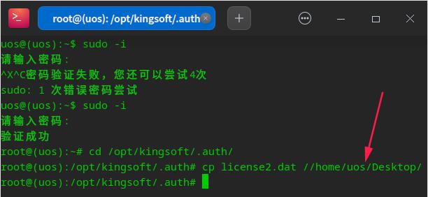 继续输入:cp license2.dat //home/uos/Desktop/(复制 license2.dat 到桌面)