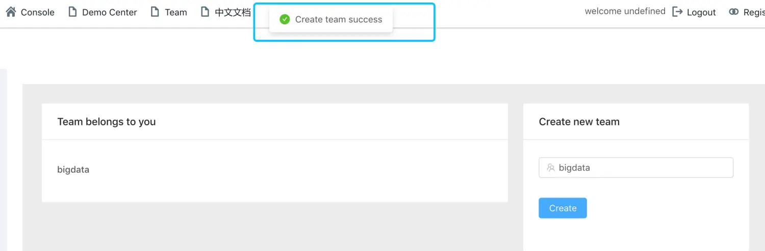 因为在MLSQL Console中,任何用户在使用控制台的时候,必须先自己创建team/role 或者加入到别人的team/role之后才能连接到真正的后端执行操作。所以这个时候你需要自己到Team标签页进行设置。