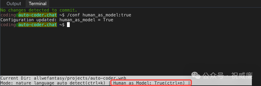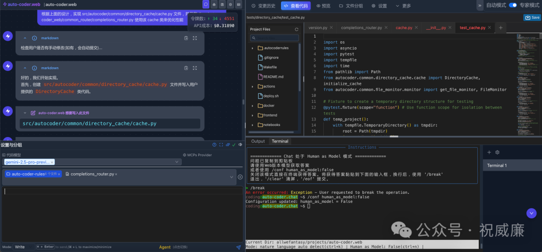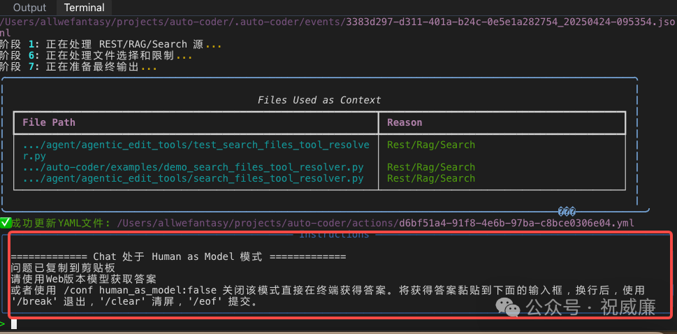 可以看到带有上下文的一个 prompt 按回车等待答案。此时,通过输入 /break 中断 auto-coder.chat 的流程: