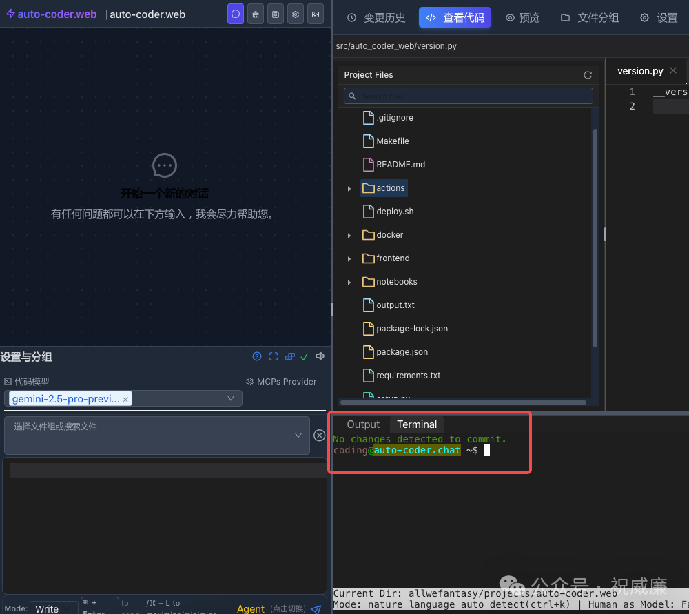 我们来看看具体做法。首先进入 auto-coder.web 的terminal界面,输入 `auto-coder.chat` 然后会有红色界面: