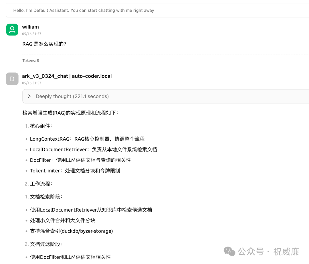 现在可以直接在cherry studio里问问题了,我询问了一个auto-coder自身,该项目已经开发了一年多,具备一定的复杂度,且RAG只是里面部分比较小功能,我们看是否能够大海捞针,准确的回答用户。下面是回答结果:
