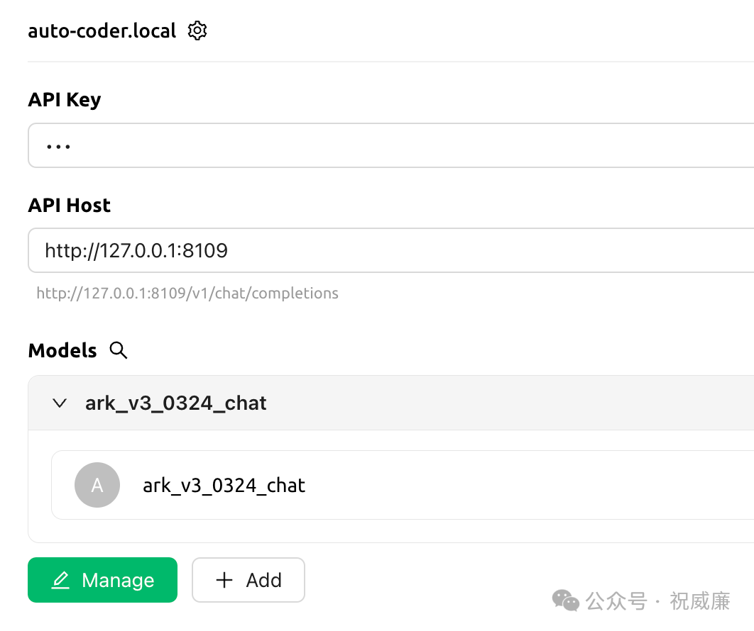 auto-coder.rag serve --agentic \--lite --port 8109 \--doc_dir /Users/allwefantasy/projects/auto-coder \--model ark_v3_0324_chat --enable_local_image_host \--required_exts .py接着在 cherry studio 配置OpenAI 兼容模型,地址为 http://127.0.0.1:8109/v1
