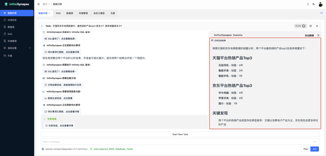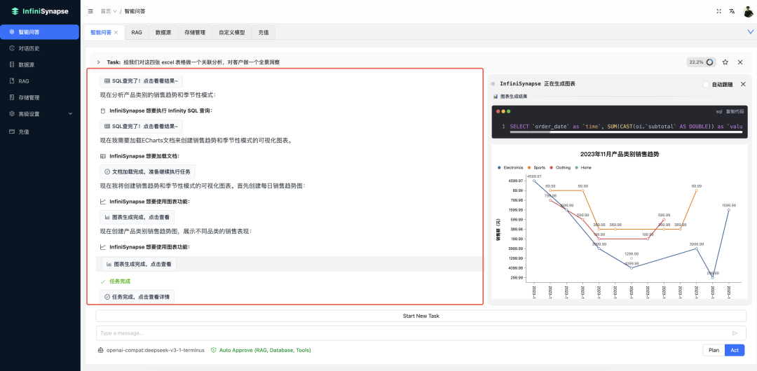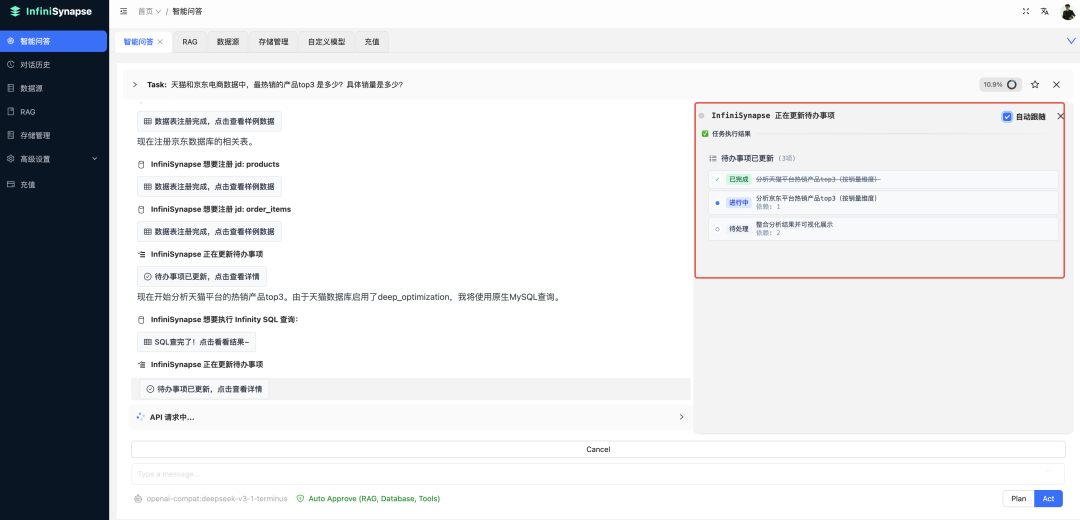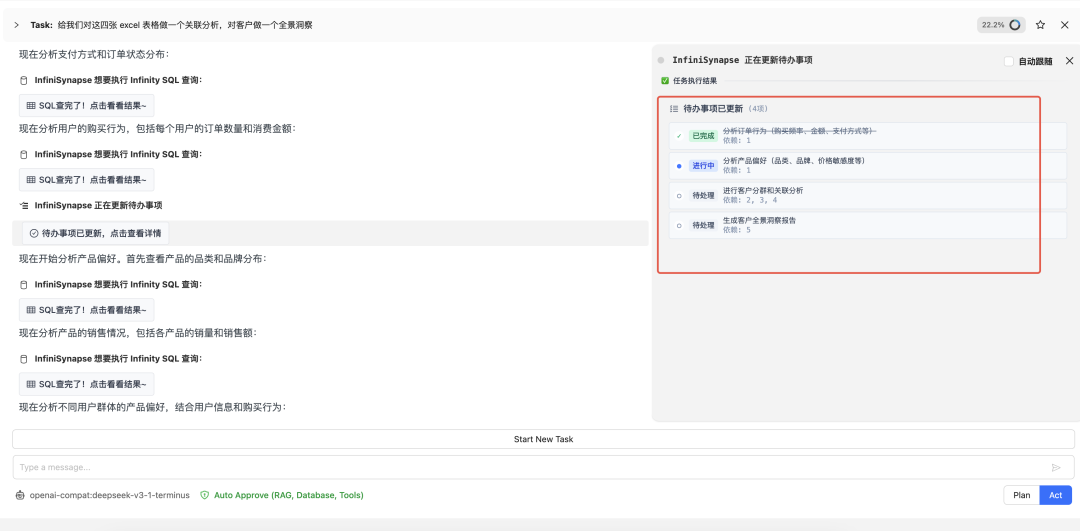 左侧展示 InfiniSynapse 每一个步骤在干什么,右侧检测每一个步骤得到了什么么。此外,我们还会把任务提前规划下,方便用户理解过程和进度,可以在右侧看到 todo 列表: