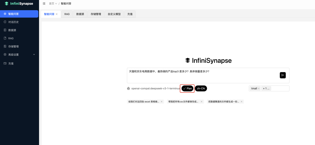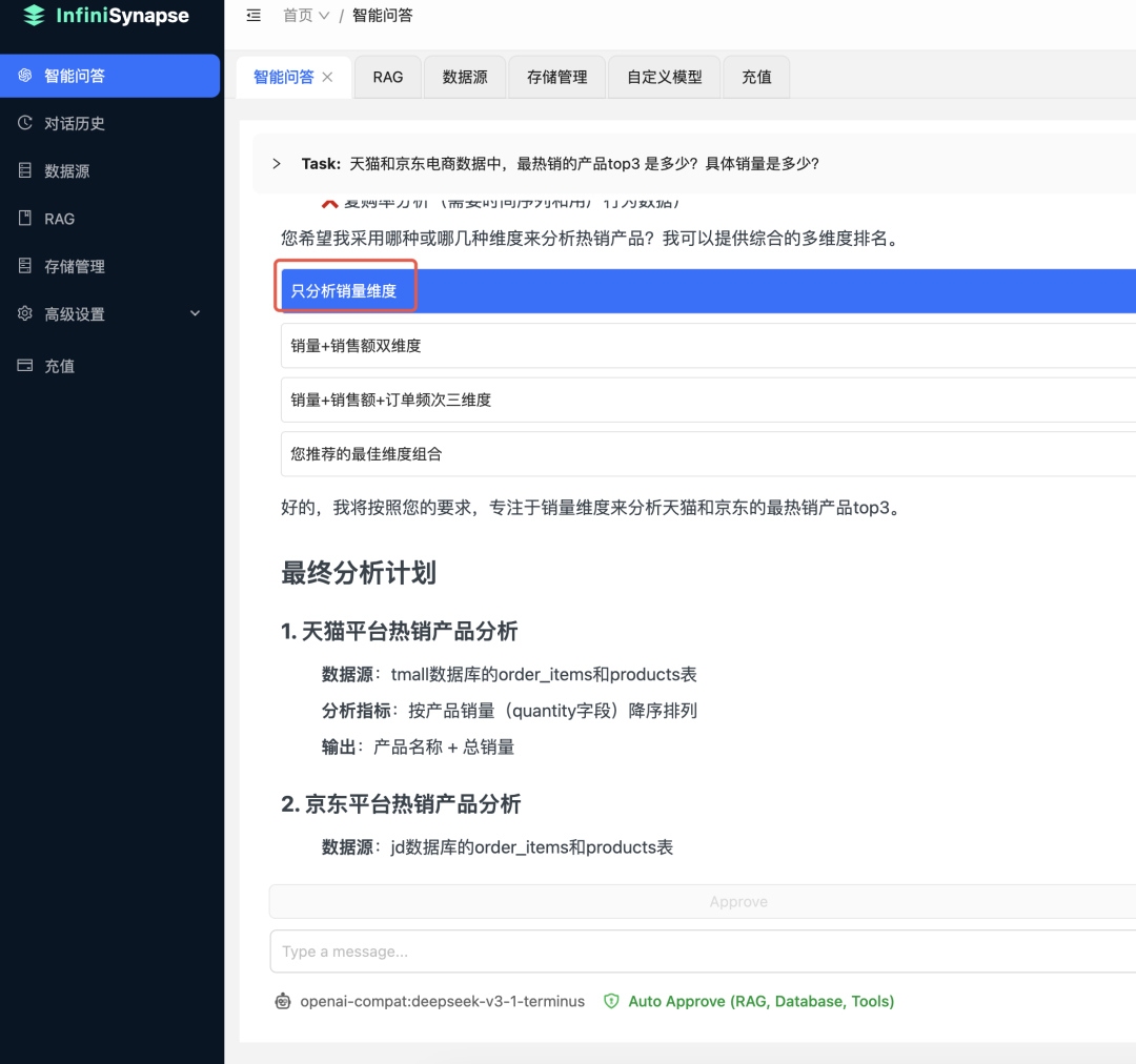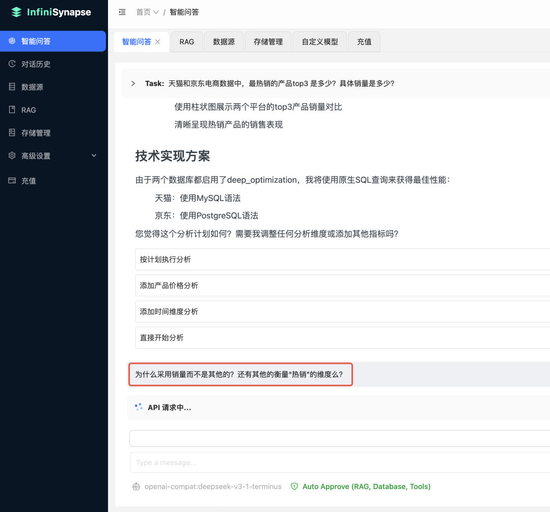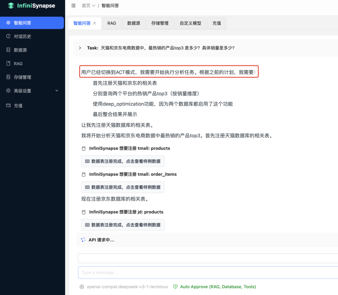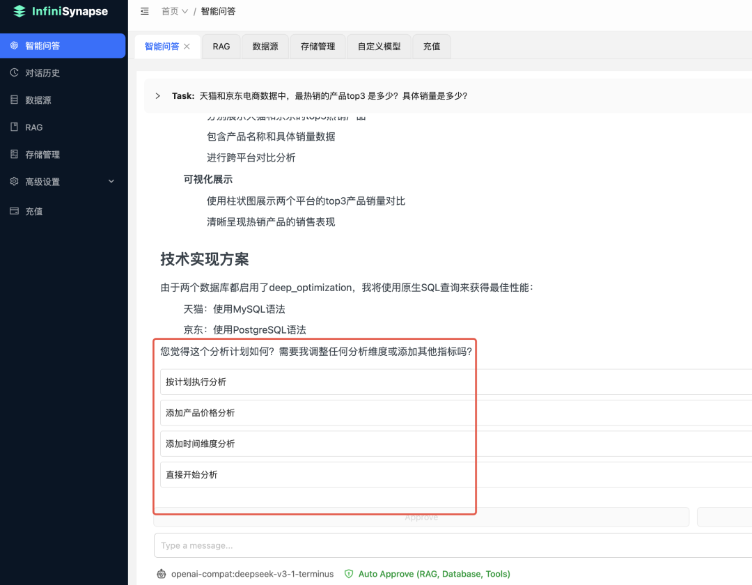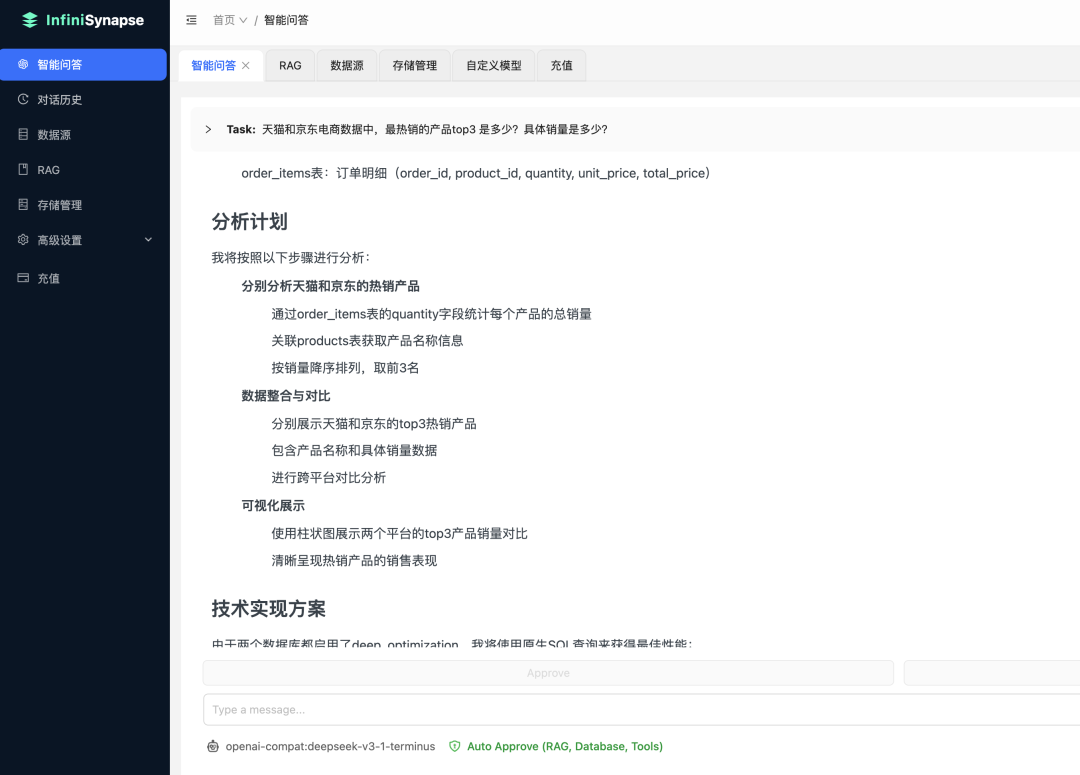 但是,我们认为这些对于建立互信还不够,所以同时也提供了 Plan 模式, InfiniSynapse 会把所有的想法和思路提前和你一起探讨,确认,最后才去执行,执行过程还会展示前面的逻辑,比如 todo, 以及每个步骤,每个步骤的结果。方便初期用户对 InfiniSynpase 的所有工作都有非常好的可观察性。