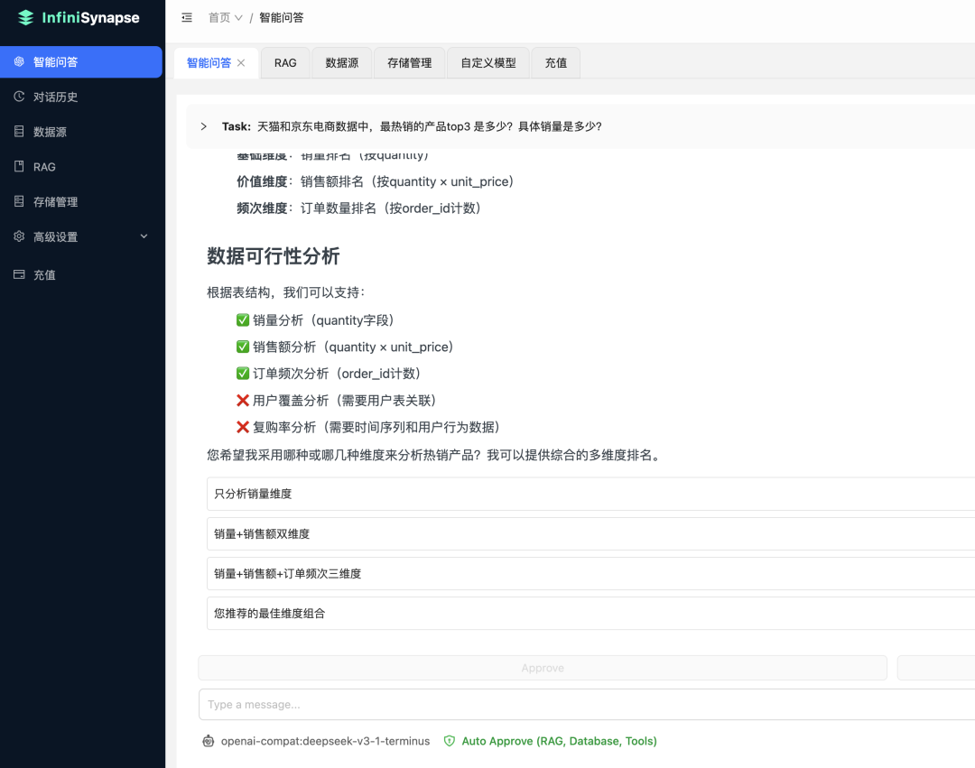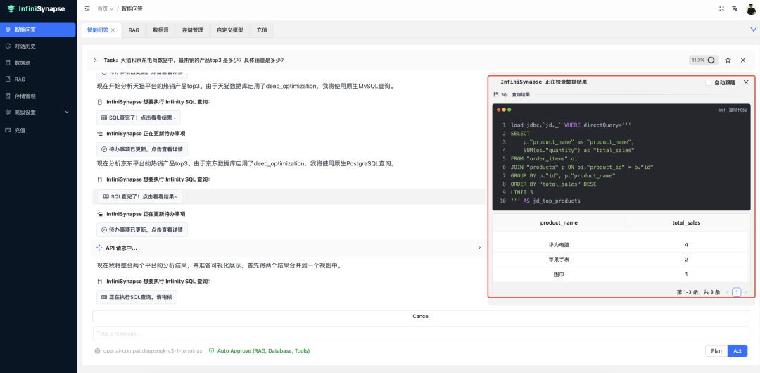 使用 Data Agent 产品,其实和一开始使用 Code Agent 产品是一样的,需要用户和产品之间有个建立互信的过程。这也是 InfiniSynapse 会有非常详细的展示: