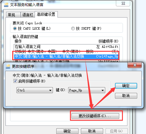 在 文本服务和输入语言 设置列表中查看一下Ctrl+Space的热键设置 并选中,点击更改案件顺序 修改一下Ctrl+Space按键,如图所示,这里我们随便修改为Ctrl+Page_Up。