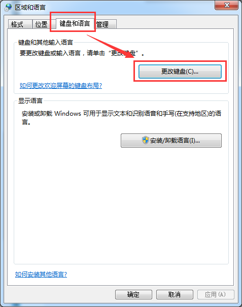 然后 点击 键盘和语言 页卡下的 更改键盘,如图所示。