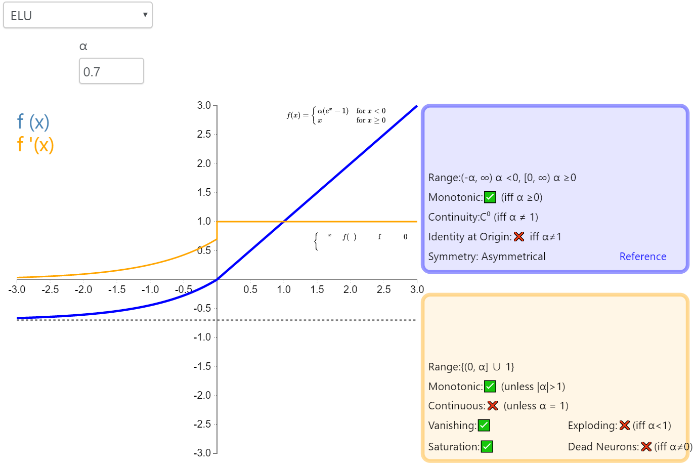 指数线性单元(Exponential Linear Unit,ELU)也属于 ReLU 修正类激活函数的一员。和 PReLU 以及 RReLU 类似,为负值输入添加了一个非零输出。和其它修正类激活函数不同的是,它包括一个负指数项,从而防止静默神经元出现,导数收敛为零,从而提高学习效率。