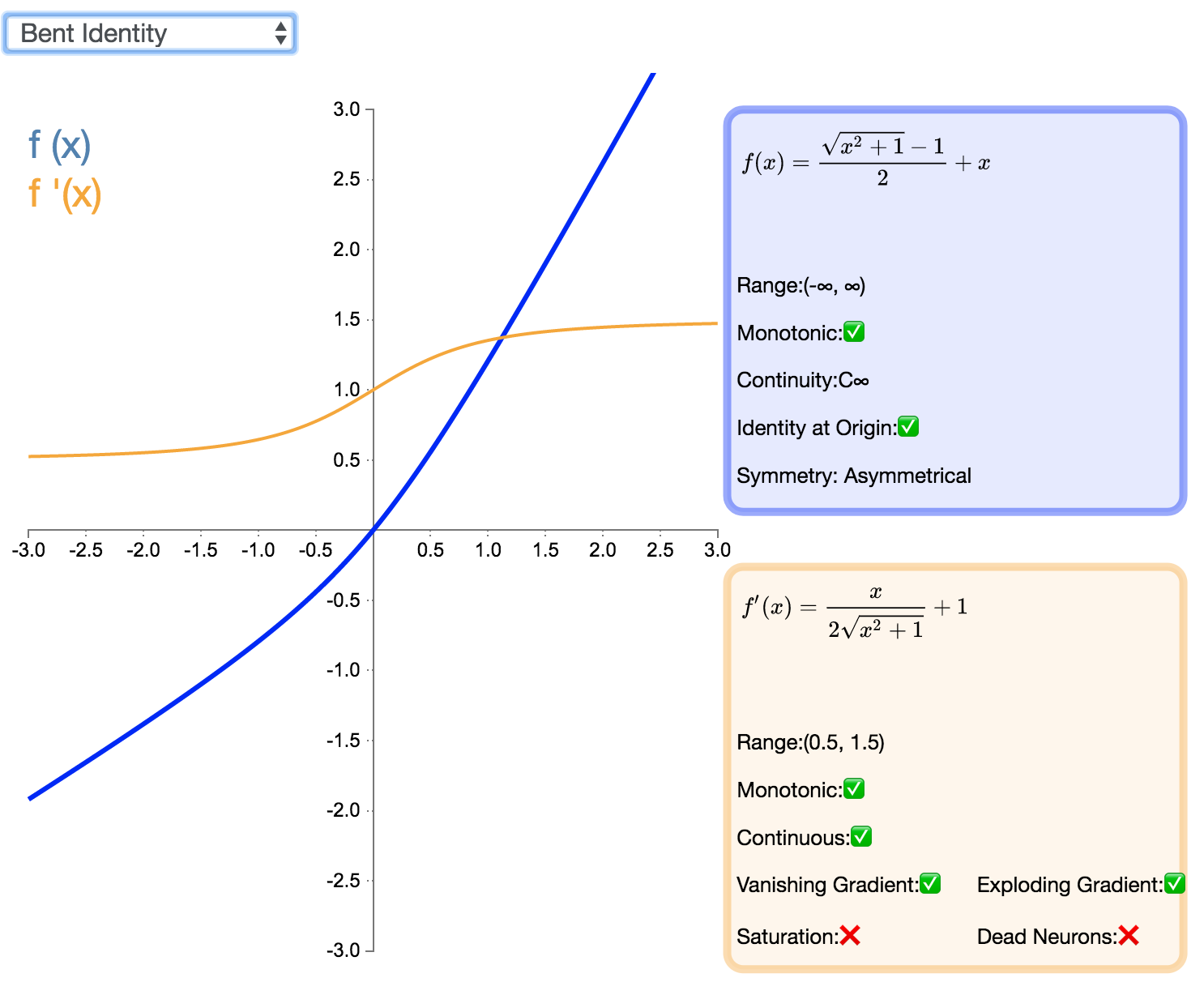 激活函数 Bent Identity 是介于 Identity 与 ReLU 之间的一种折衷选择。它允许非线性行为,尽管其非零导数有效提升了学习并克服了与 ReLU 相关的静默神经元的问题。由于其导数可在 1 的任意一侧返回值,因此它可能容易受到梯度爆炸和消失的影响。